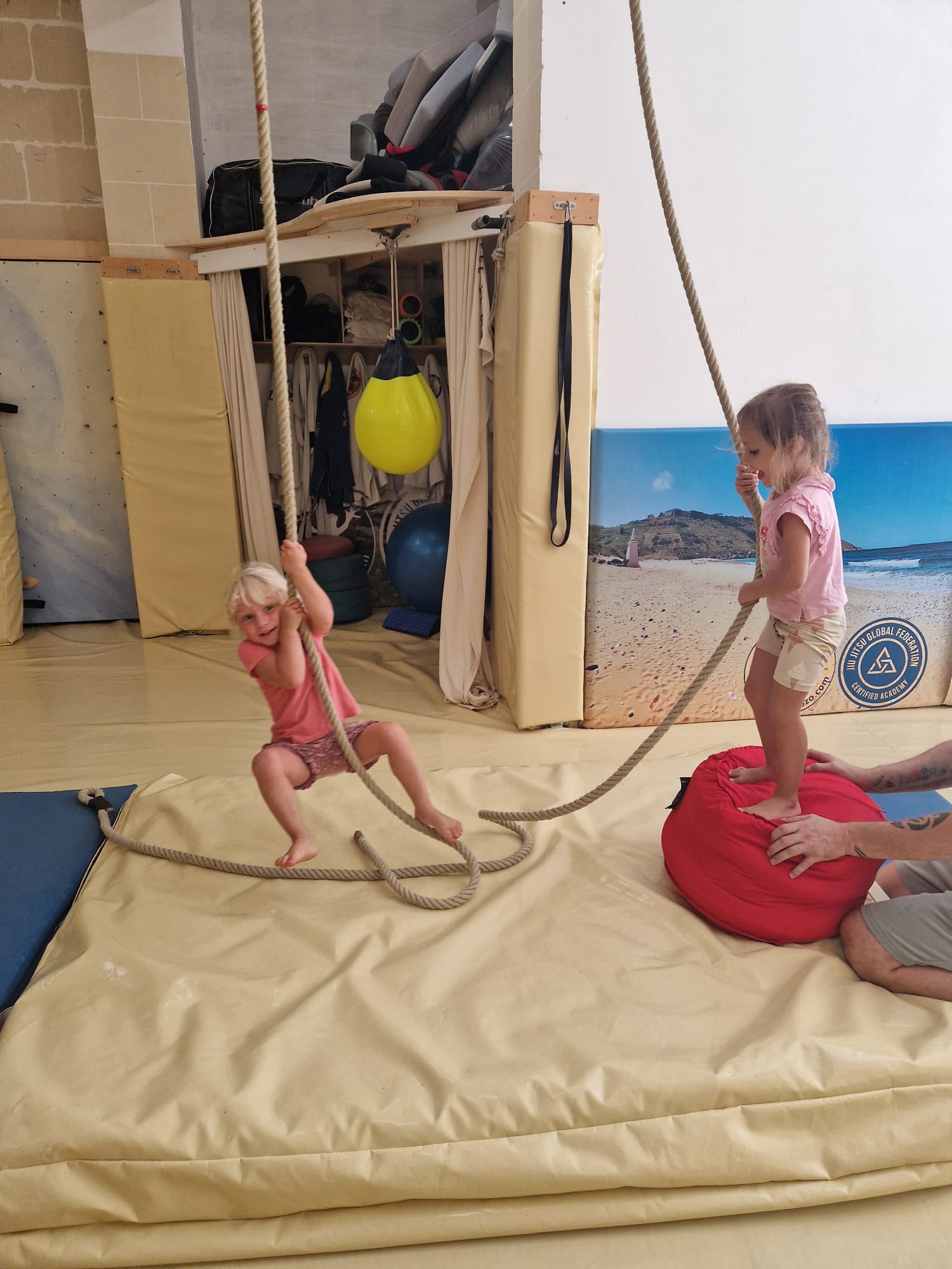 - 3 to 5 years old : they start with the most simple things, enjoying games, ninja parkour around all the equipment we like to have on the mats : big crush mats, balance balls, skipping balls, all kind off games around balls, balance, coordination where they interact in a group with other kids.